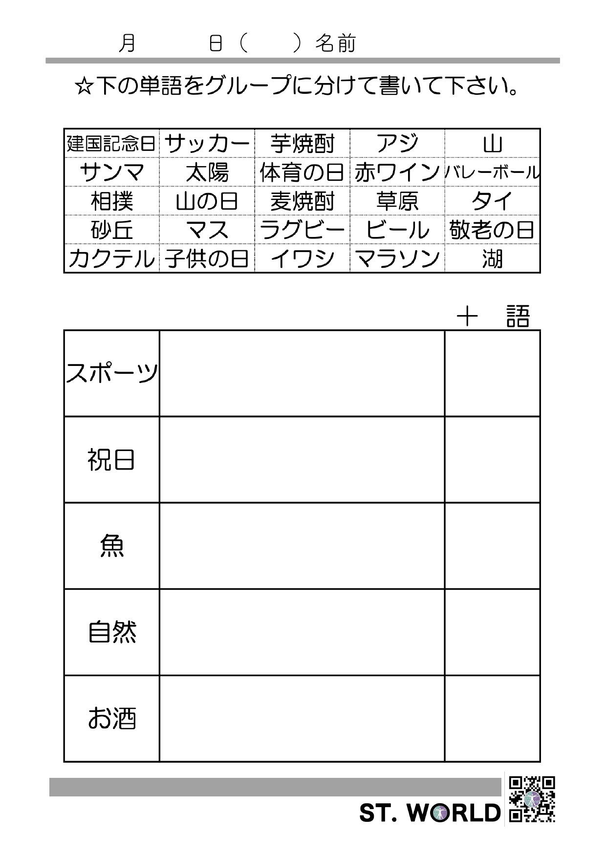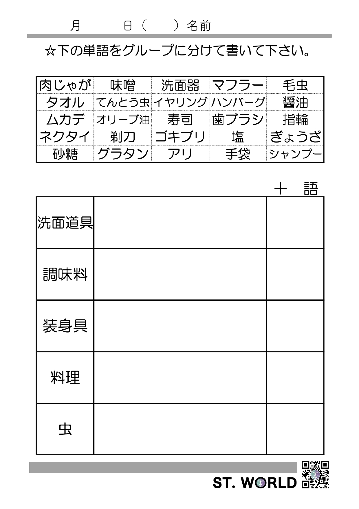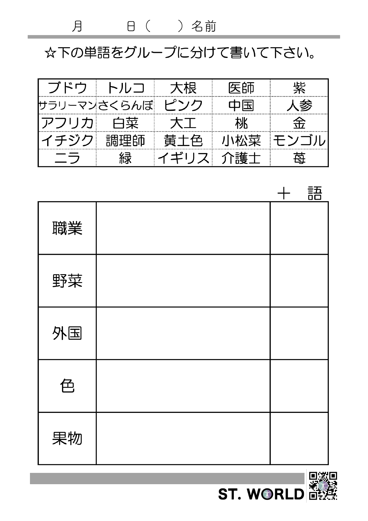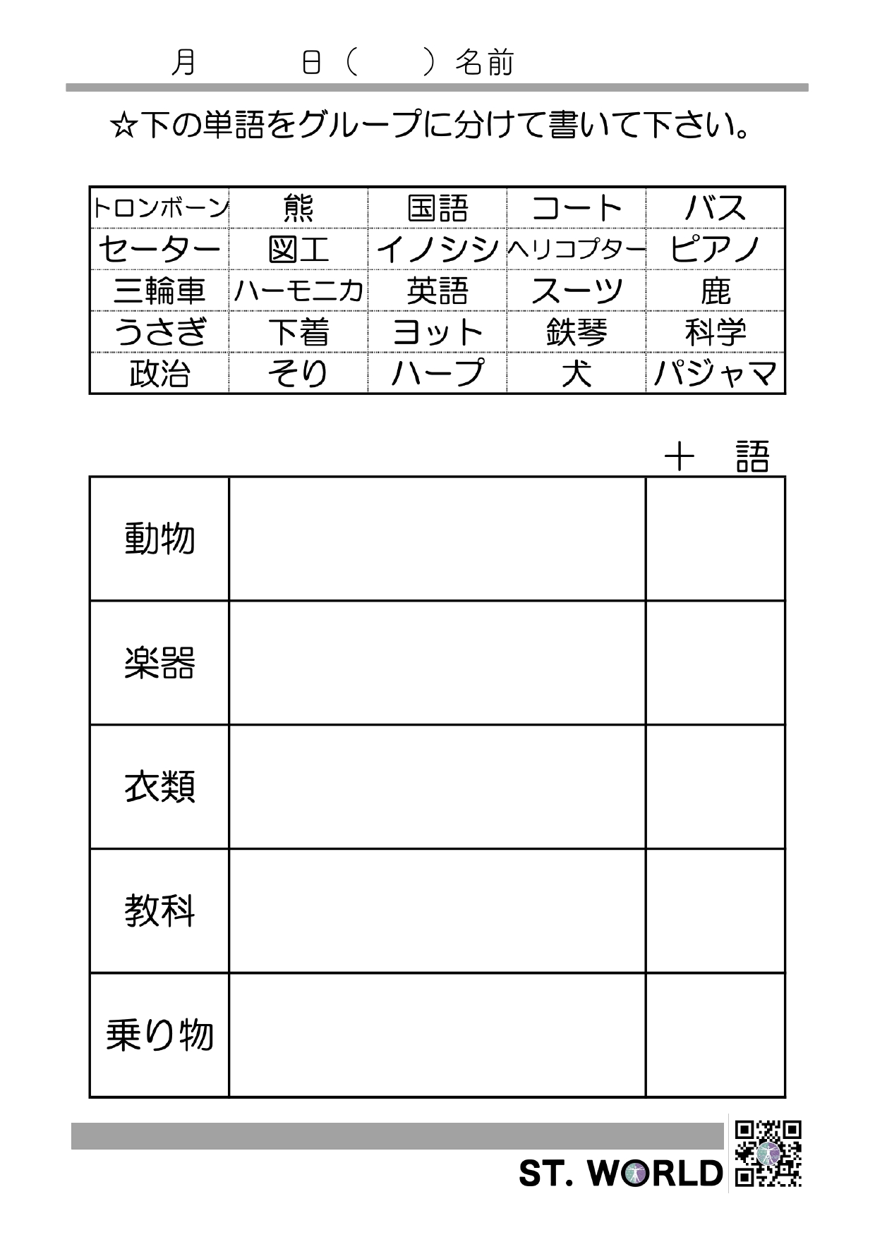 カテゴリー分類課題2 2026 2/08 訓練教材 2026年2月8日 やや難易度の高いカテゴリー分類課題です。ダウンロード可能ですので,臨床でお役立てください。 カテゴリー分類2-1 カテゴリー分類2-2 カテゴリー分類2-3 カテゴリー分類2-4 カテゴリー分類2-5 カテゴリー分類2.まとめ 訓練教材 文章読解100文字 漢字⇄仮名書字課題 この記事を書いた人 ST.ワールド STワールドは、言語聴覚士(ST)による、言語聴覚士のための学びと交流の場として誕生しました。現場で活躍するST同士が知識や経験を共有し合い、より質の高い支援を提供できるようサポートしています。 関連記事 絵と文字の照合課題 2026年2月14日 漢字⇄仮名書字課題 2026年2月8日 文章読解100文字 2026年2月8日 カテゴリー分類課題1 2026年2月8日
