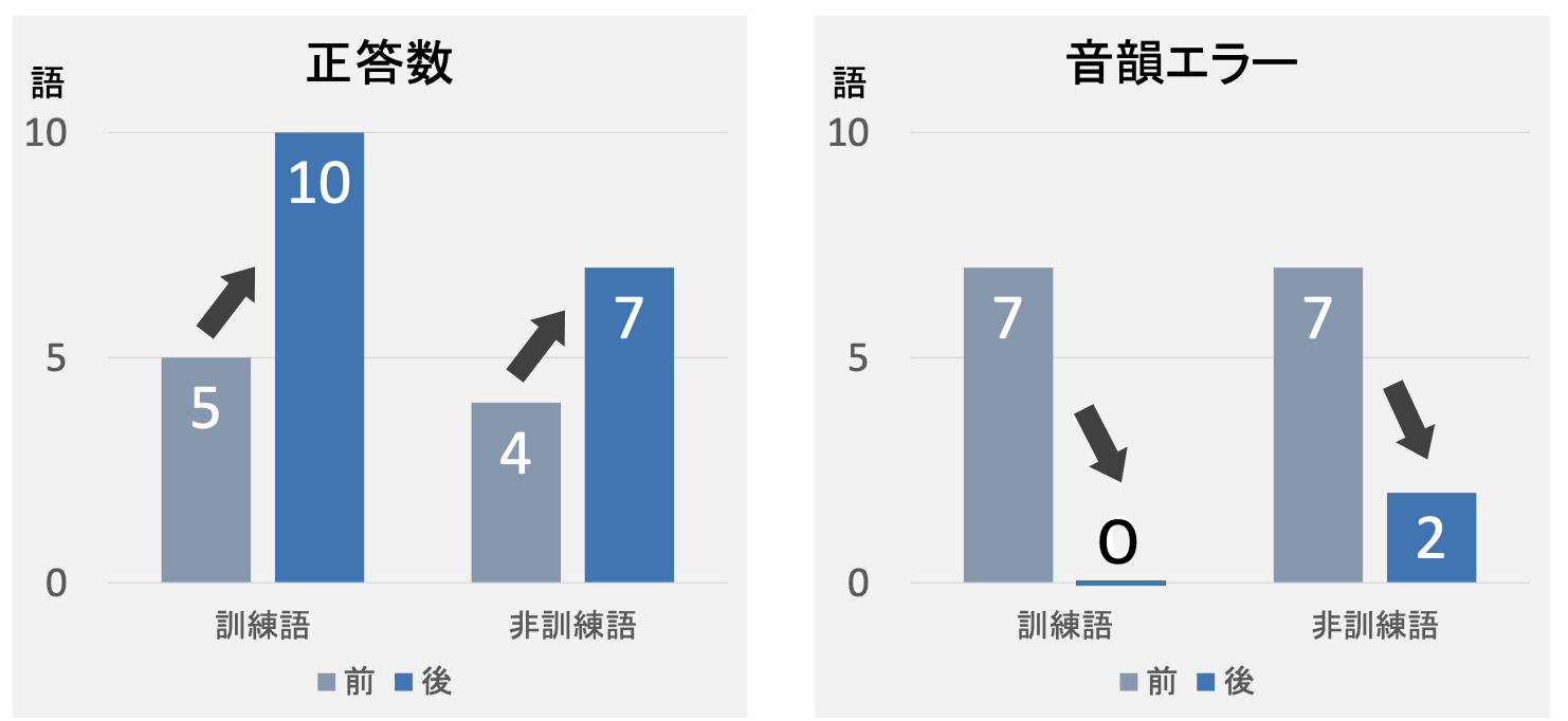 その結果、訓練語だけでなく非訓練語にも改善がみられ、音韻処理全体への汎化の可能性が示唆されました。