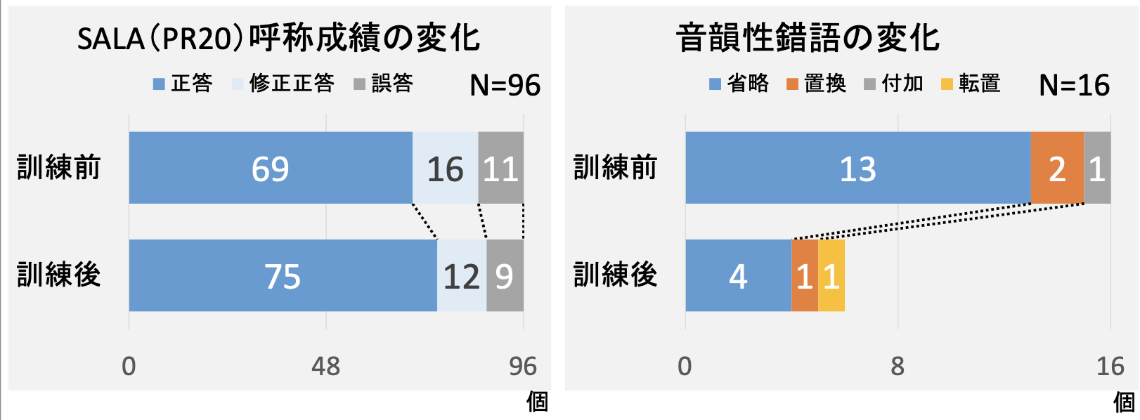 実際のSALA呼称成績では、音韻性錯語としての「省略」が13個から4個へと激減しました。