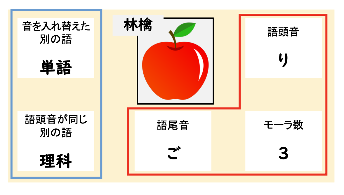 - 語尾1音が合う語:りんご→「たまご」