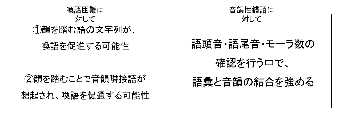 言葉の検索そのものに難渋する「喚語困難」が主体の症例には、「韻を踏む語(ライム)」の抽出と提示が有効な可能性があります。。